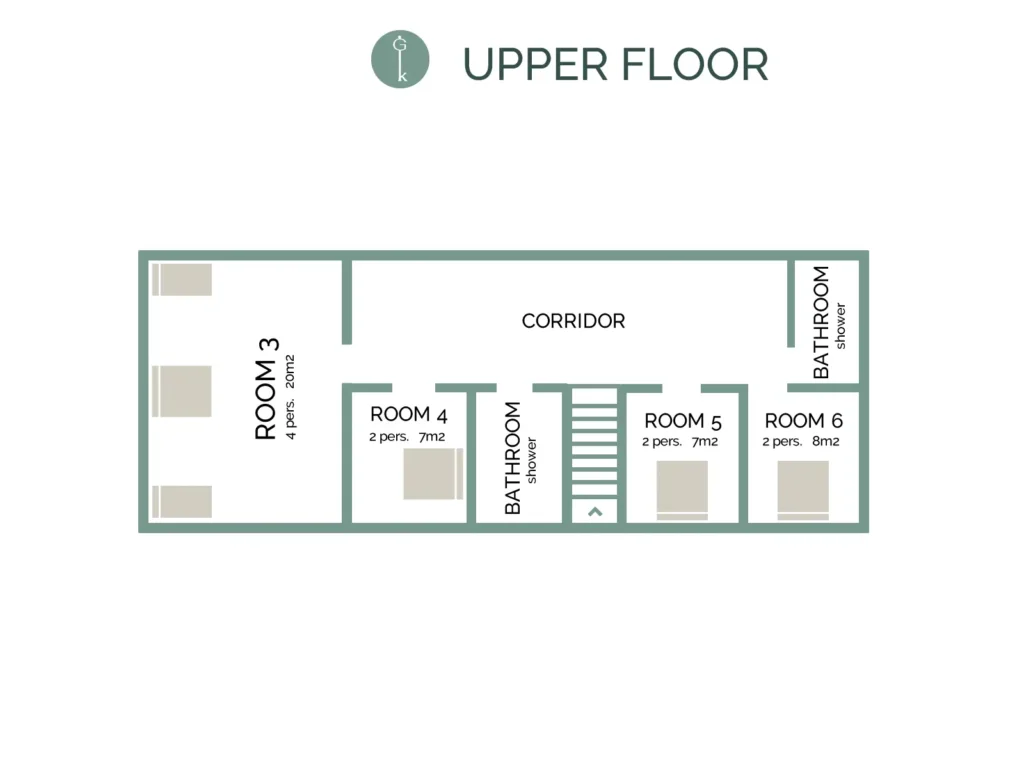 The guest house spans 200 square meters, featuring five double rooms and one spacious family room. The six rooms share three well-equipped bathrooms, ensuring comfort for all guests.