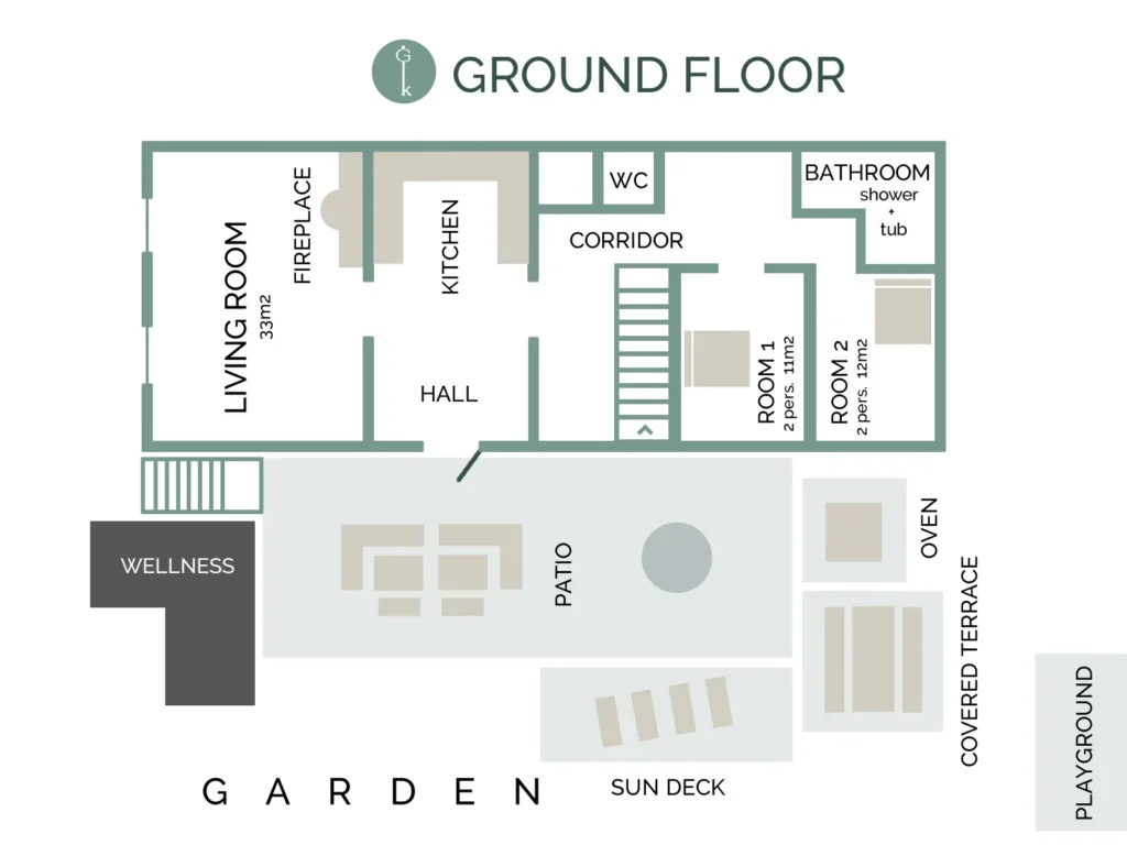 The house offers 200 square meters of space, featuring five double rooms and one family room with four beds, comfortably accommodating up to 14 guests. The six rooms share three bathrooms. Guests can enjoy a spacious, fully equipped kitchen with a breakfast bar (20 m²), and a generous 33 m² living room, perfect for communal life. The living area features a cozy fireplace, a dining table for 14, and a separate lounge area, ideal for relaxed conversations and shared moments.